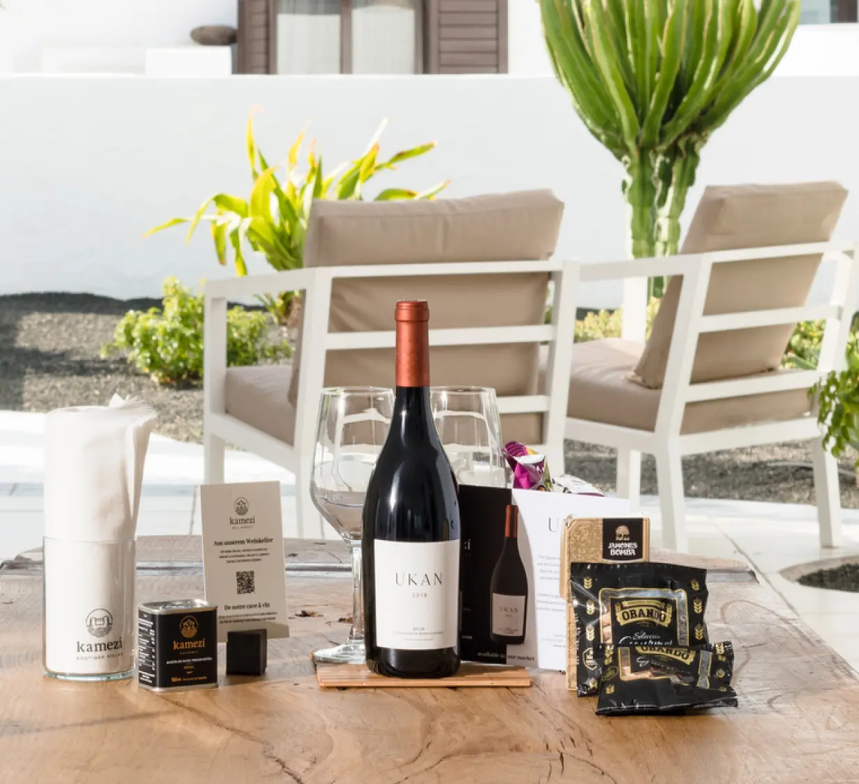 Bottle of Wine D.O. Rioja (Designation of Origin), Kamezí oil, homemade bread, water, coffee capsules, tea, sugar, ice.